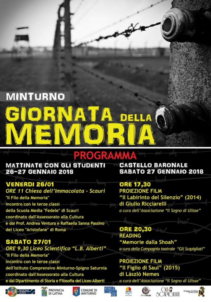 L’Associazione Culturale “Il Sogno di Ulisse”, con la collaborazione del Comune di Minturno e della Compagnia teatrale “Gli Scapigliati”, ha organizzato per il 27 Gennaio 2018 la Giornata della Memoria al Castello Baronale di Minturno. Saranno proiettati due film: alle ore 17,30 “Il labirinto del silenzio” (2014) di Giulio Ricciarelli e alle ore 20,30 “Il figlio di Saul” (2015) di László Nemes. Quest’ultimo sarà introdotto dal Reading “Memorie dalla Shoah” curato da Gli Scapigliati – Compagnia Teatrale con letture tratte dal Diario di Anna Frank, da Primo Levi, Elsa Morante, Poesie ebraiche. La Giornata sarà anticipata da due mattinate con le scuole (26 e 27 gennaio), curate dall’Assessorato alla Cultura. Un appuntamento a cui non si può mancare.