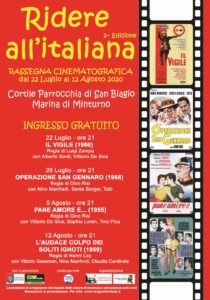 Dal 22 Luglio a 12 Agosto 2020 si svolgerà presso il Cortile della Parrocchia di San Biagio a Marina di Minturno la seconda edizione della rassegna cinematografica “Ridere all’Italiana”, organizzata dall’Associazione Culturale “Il Sogno di Ulisse” e dalla Chiesa di San Biagio, grazie alla sensibilità di Don Maurizio Di Rienzo. L’evento, sotto il patrocinio del Comune di Minturno, si svolgerà nel rispetto delle misure di sicurezza dell’emergenza Covid-19 e del distanziamento sociale con ingresso gratuito e capienza massima di 100 persone (è necessaria la prenotazione).