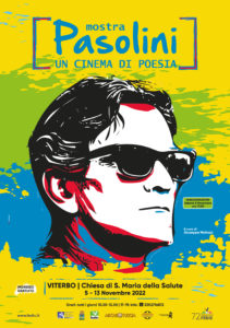Nel centenario della nascita (Bologna, 1922), le associazioni Archeotuscia e Il Sogno di Ulisse dedicano una mostra iconografica a Pier Paolo Pasolini, intellettuale scomodo, poeta, regista, tra i più importanti esponenti del Novecento italiano, che si terrà dal 5 al 13 Novembre 2022 presso la Chiesa di S. Maria della Salute, a ingresso gratuito. Attraverso manifesti, locandine, fotobuste e altro materiale, provenienti dalla collezione privata del giornalista Giuseppe Mallozzi (presidente del Cineclub Fedic “Il Sogno di Ulisse” di Minturno), sarà tracciato un percorso espositivo che attraverserà l’intera carriera cinematografica del poeta di Casarsa, da Accattone fino alla sua ultima, dolorosa opera, Salò o le 120 giornate di Sodoma.